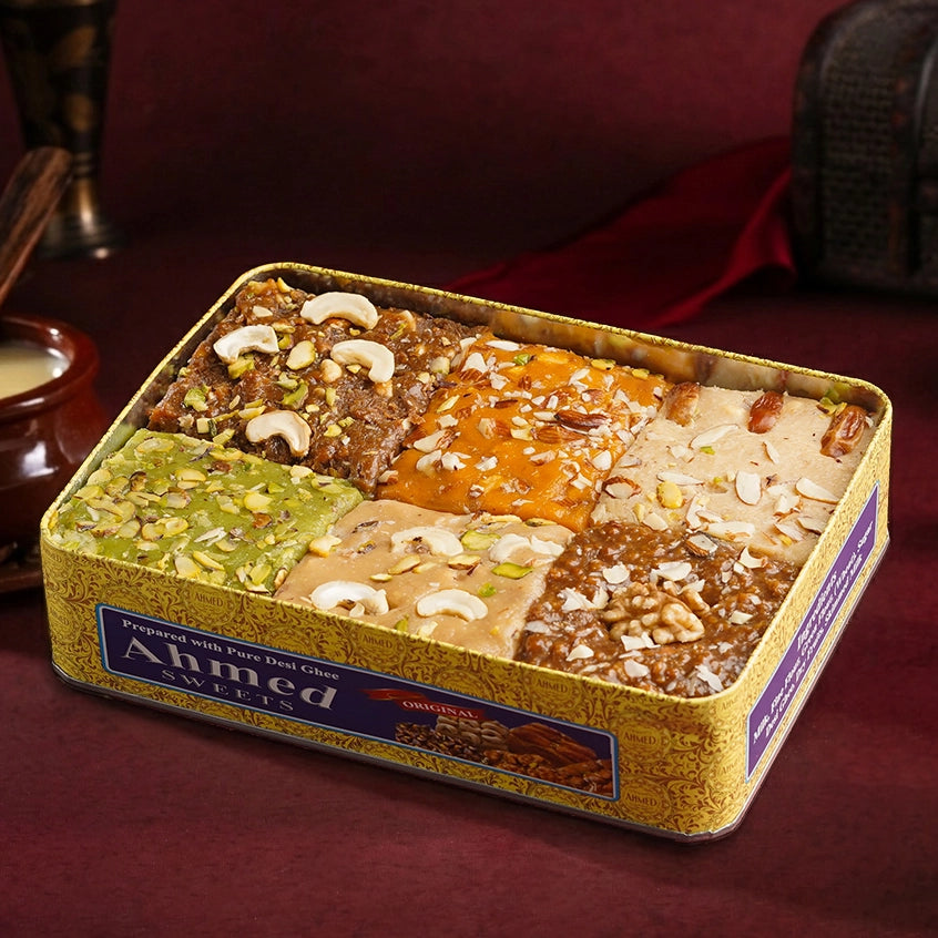 Indulge in six premium halwa flavors, slow-cooked in pure desi ghee and enriched with rich dry fruits. Each 2kg tin contains approximately 335g of each flavor—perfectly portioned for gifting or savoring yourself.
